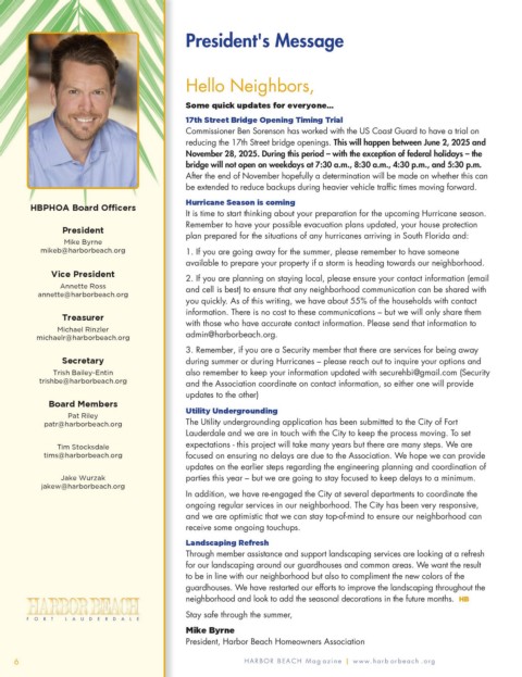 trishbe@harborbeach.org and the Association coordinate on contact information, so either one will provide