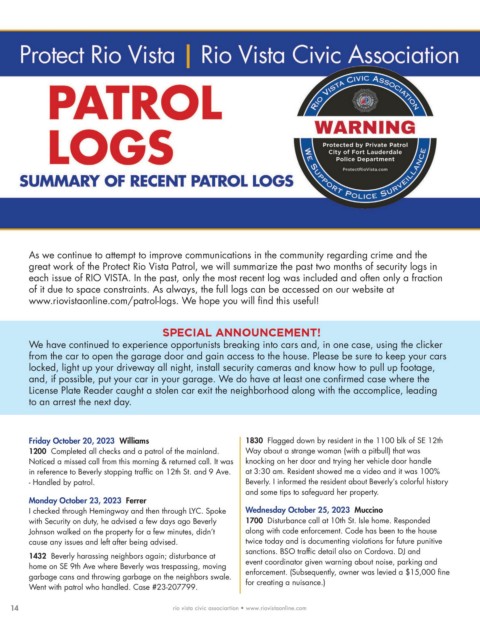 great work of the Protect Rio Vista Patrol, we will summarize the past two months of security logs in