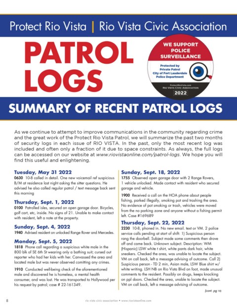 and the great work of the Protect Rio Vista Patrol, we will summarize the past two months