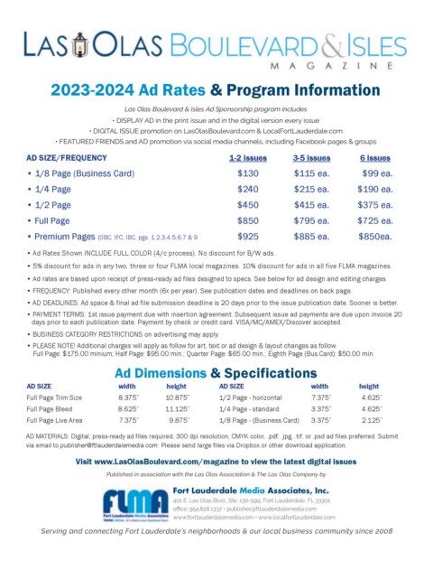 • 5% discount for ads in any two, three or four FLMA local magazines. 10% discount for ads in all five FLMA magazines.